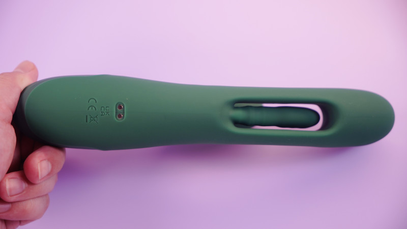 Верхняя кнопка отвечает за включение язычка в вагинальной части, нижняя вибрацию в вагинальной и клиторальной частях, единоразовым нажатием на кнопку включения можно управлять стимуляцией в клиторальной части.